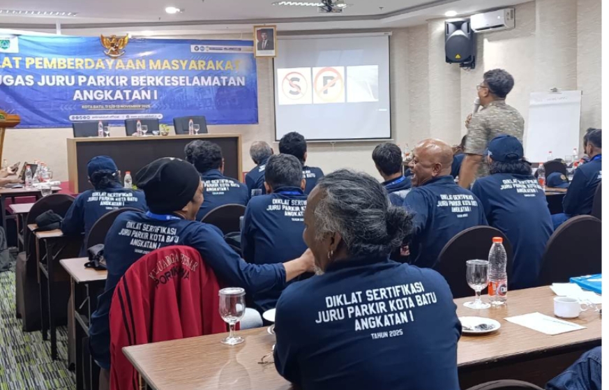 Batu | Serulingmedia.com – Dinas Perhubungan (Dishub) Kota Batu menggelar Diklat Sertifikasi Juru Parkir Kota Batu Angkatan I Tahun 2025 di Hotel Samara, Selasa–Kamis (11–13/11/2025).