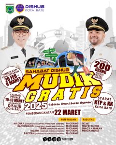 Batu I Serulingmedia.com – Dinas Perhubungan (Dishub) Kota Batu untuk pertama kalinya membuka program mudik gratis dalam rangka Hari Raya Idul Fitri 1446 H. Dengan mengusung tagline “Sahabat Dishub, Mudik Gratis 2025, Lebaran Aman, Liburan Nyaman”, program ini bertujuan untuk memfasilitasi warga Kota Batu yang ingin pulang kampung dan merayakan Lebaran bersama keluarga.