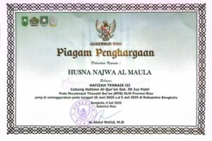 Husn Najwa Al Maula, mahasiswi Program Studi Psikologi semester 5, berhasil meraih Juara 3 dalam ajang Musabaqah Tilawatil Qur’an (MTQ) ke-43 Provinsi Riau Tahun 2025 kategori Hafalan Al-Qur’an 30 Juz.