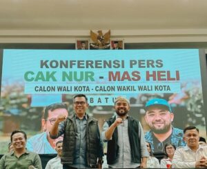 Batu | Serulingmedia.com. – Pasangan calon Wali Kota dan Wakil Wali Kota Batu, Nurochman dan Heli Suyanto, resmi diperkenalkan oleh Partai Kebangkitan Bangsa (PKB) dan Partai Gerindra dalam konferensi pers yang digelar di Jambu Luwuk Convention Hall & Resort Batu, Kamis sore ( 22/8/2024 ).
