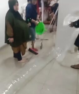 Di tengah situasi tersebut, para pedagang bergotong royong membersihkan air yang menggenang di lantai pasar.