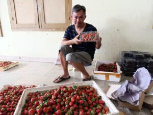 “Kami ingin mempertahankan kondisi pasar dan menjaga komitmen dengan pelanggan, maka kami mendatangkan stroebery dari Bandung,” ujar Nur Sudarto saat menyiapkan kiriman strowbery kepada pelanggan.