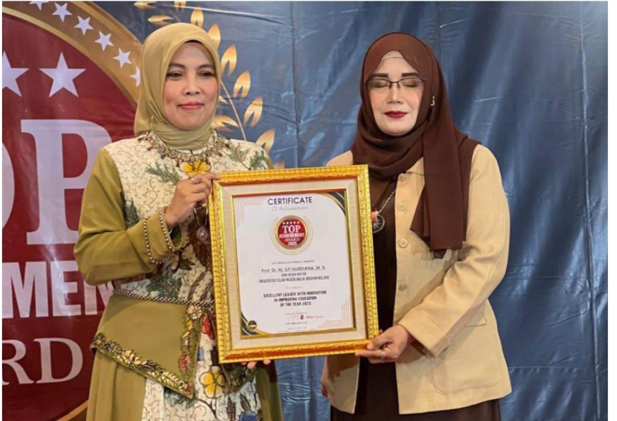Malang | Serulingmedia.com – Prestasi gemilang kembali diraih Universitas Islam Negeri (UIN) Maulana Malik Ibrahim Malang. Rektor Prof. Dr. Hj. Ilfi Nur Diana, M.Si., CAHRM., CRMP., berhasil menyabet Top Achievement Award 2025 dengan kategori Tallent Leader with Innovation in Improving Education of The Year 2025. Penganugerahan bergengsi ini berlangsung di Surabaya, Jumat (22/8/2025).