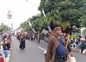 Tak jauh di belakang, kelompok warga laki-laki berjalan kaki mengiringi mobil hias dengan penuh semangat. Mereka mengenakan pakaian adat khas desa sambil membawa alat kerja seperti cangkul, palu, linggis, dan gergaji.