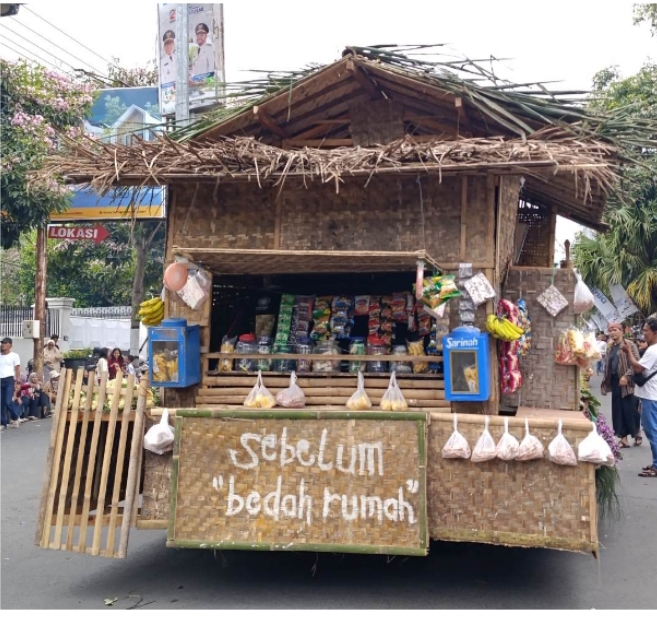 Tema tersebut divisualisasikan melalui rumah gubuk yang diusung di atas mobil hias—melambangkan titik awal perjuangan dan transformasi sosial masyarakat dalam membangun kehidupan yang lebih layak.