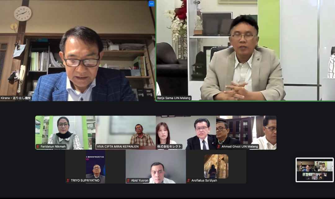 Pertemuan tersebut dihadiri Wakil Rektor Bidang Pengembangan Lembaga dan Kerja Sama Prof. Dr. H. M. Abdul Hamid, S.Ag., M.A., Wakil Rektor Bidang Kemahasiswaan Prof. Dr. H. Triyo Supriyatno, M.Ag., Kepala Kantor Urusan Internasional Faridatun Nikmah, M.Pd., serta Ketua Pusat Teknologi Informasi dan Pangkalan Data (PTIPD) Abid Yusron. Turut hadir pula Ketua LPM, tim Wakil Rektor Bidang Kerja Sama, serta perwakilan Select Hiroshima Jepang yang dipimpin Presiden Direktur Inatsu San.