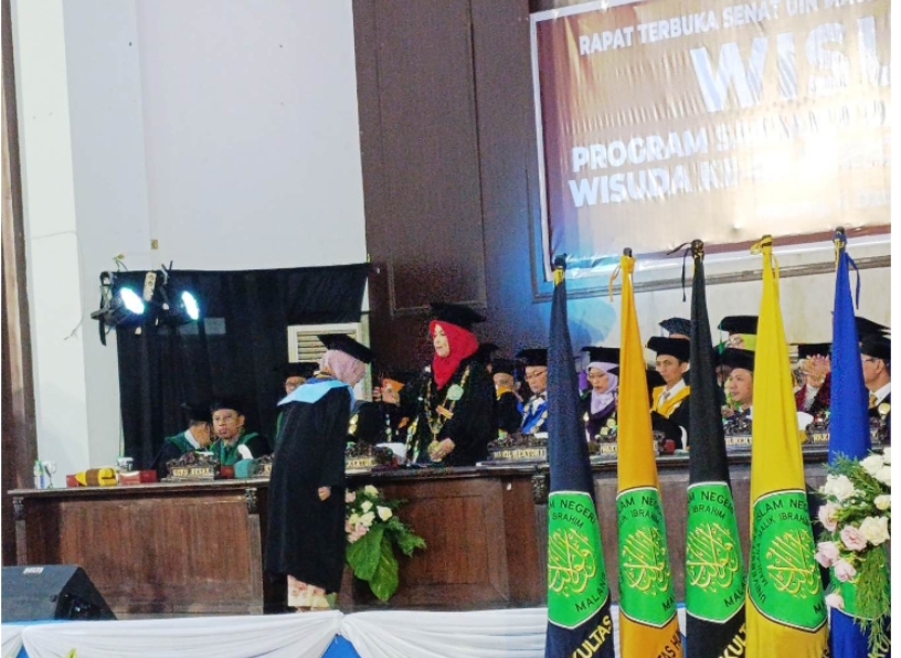 Rektor UIN Maliki Prof. Dr. Hj. Ilfi Nur Diana M.Si secara simbolik mengukuhkan wisudawan dengan memindahkan tassel rumbai topi akademik kepada wisudawan terbaik Renata Tiand Indriansyah sebagai lulusan terbaik.